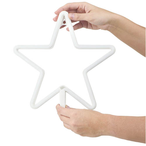 Neón Flexible + Plástico. 26 x 27 x 2,2 cm. Funciona con conexión USB o con 3 pilas AA de 1.5V (no incluidas).