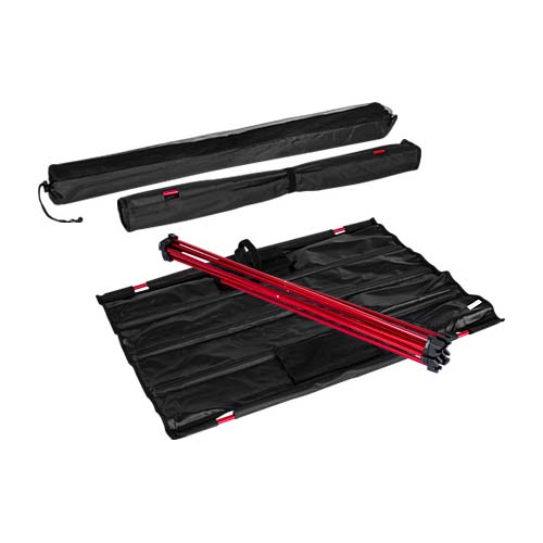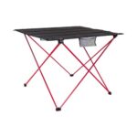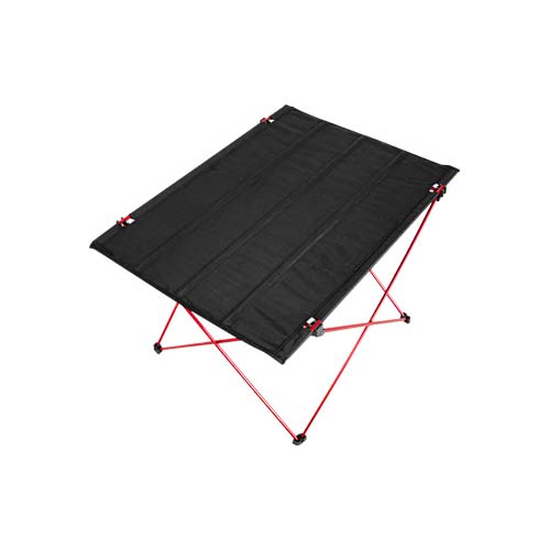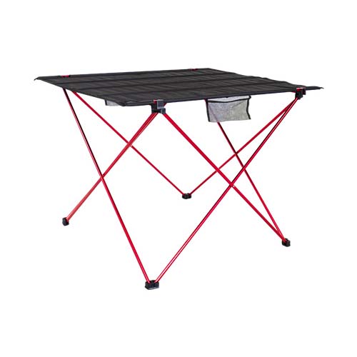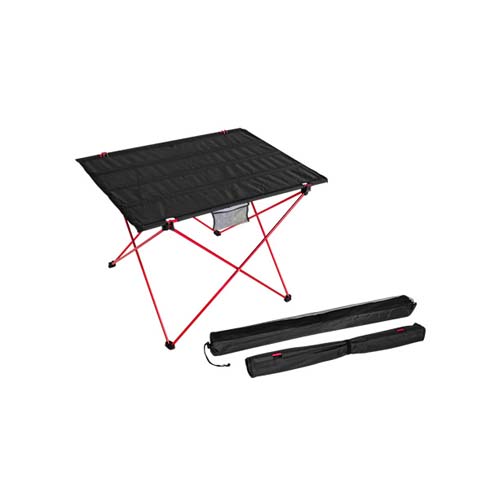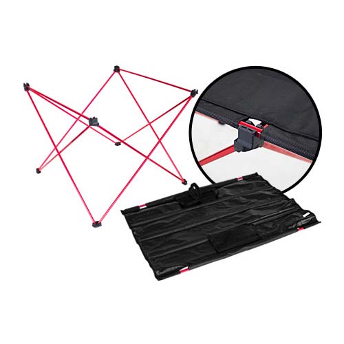 Mesita plegable de Picnic. Estructura base plegable y desarmable de aluminio color rojo, cubierta plegable en tela Oxford 600D color negro. Incluye 2 bolsillos de malla para accesorios. Ideal para llevar de picnic o a actividades al aire libre. Es muy liviana, pesa sólo 1 kg. y como es plegable y desarmable, ocupa muy poco espacio, se guarda dentro de un bolsito (incluido) de sólo 100 x 12.7cm