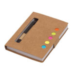 Cartón. Material reciclado. 80 hojas lisas blancas. 5 blocks autoadhesivos rectangulares de diferentes colores. 1 bolígrafo de pasta negra.