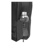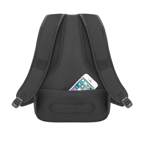 Capacidad 12 litros. Polyester. Mochila con dos bolsillos externos que permite guardar el cierre dentro de la costura para que no se vea. Cuenta con tres compartimentos, el primer compartimento cuenta con dos espacios para guardar celular y bolígrafos. Segundo compartimento acolchado, un bolsillo con cierre y 3 bolsillos pequeños. Tercer compartimento acolchado. Parte posterior acolchada con red que permite la ventilación de la espalda y un bolsillo pequeño con cierre. En los laterales dos bolsillos de red que se encuentran cubiertos por polyester con cierre. Los tiradores del cierre son metálicos.
