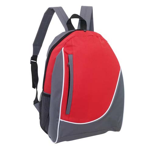 Capacidad 18 litros aprox. Polyester 600D. Bolsillo frontal con cierre y vivos blancos. Un compartimento principal. Correas regulables y herrajes plásticos.