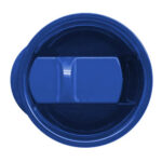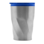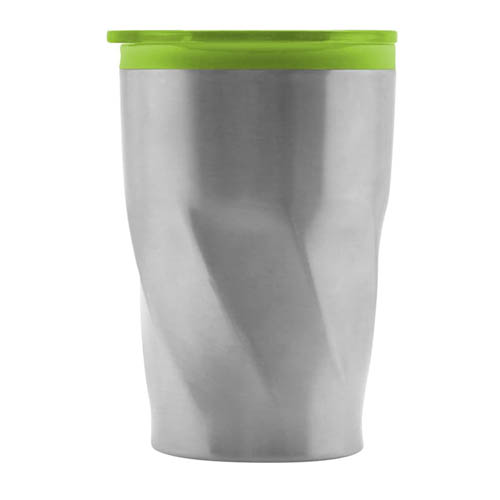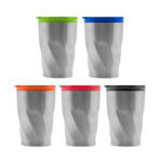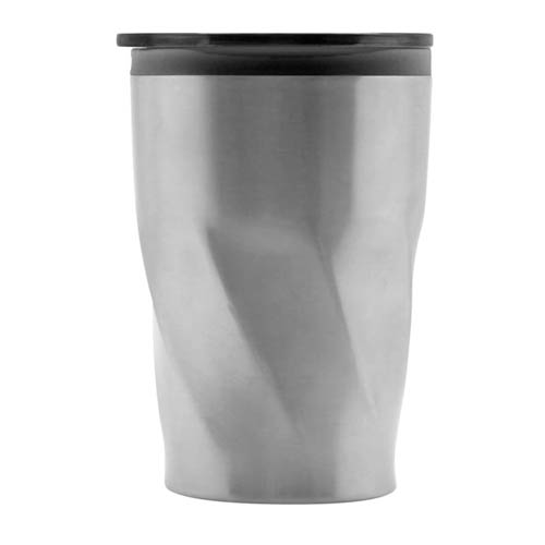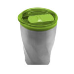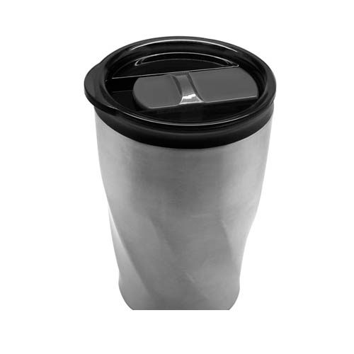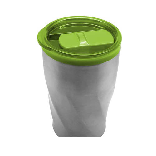 Acero inoxidable y plástico. Capacidad 380 ml. Interior plástico y exterior metálico con detalles. Tapa de color con traba la cual asegura que el liquido no se derrame. Con base de goma antideslizante.