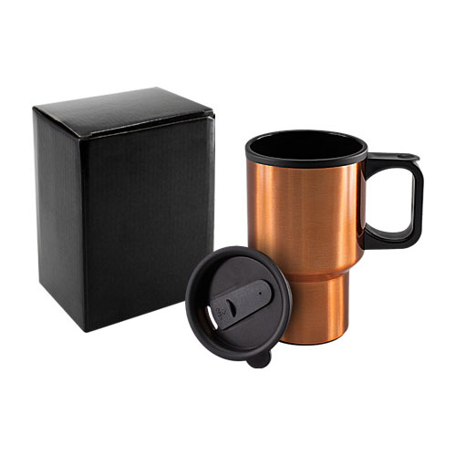Mug metálico encobrizado, tapa con dosificador. Interior, tapa y asa de PVC negro. Presentación en estuche de cartón laminado negro.