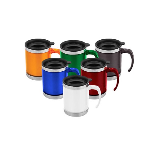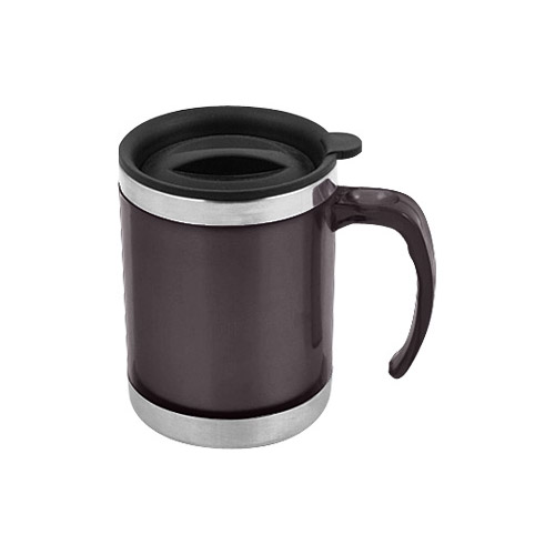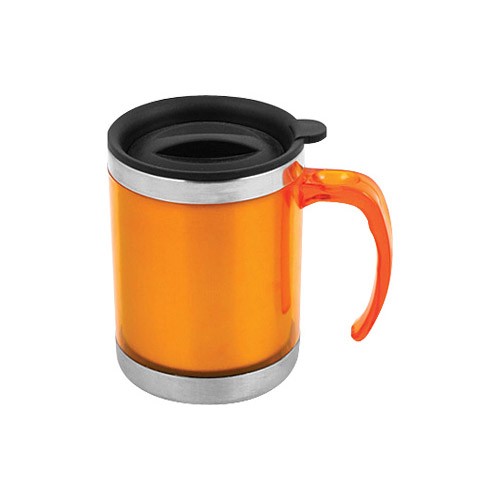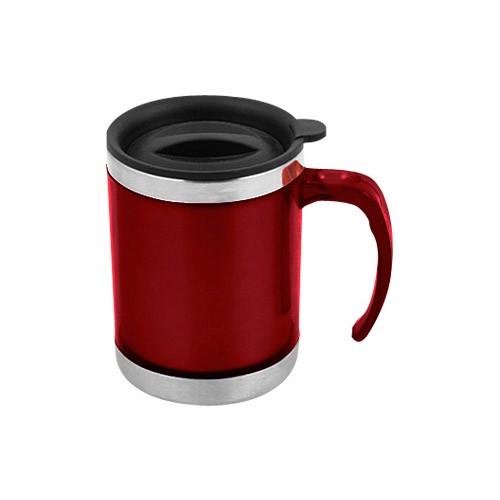 Mug térmico de doble pared aislante con tapa pull-up de PVC negro y dosificador. Base interior de Acero Inoxidable y pared exterior de PVC traslúcido.