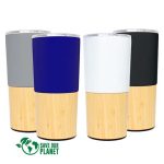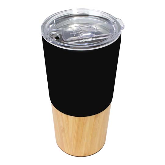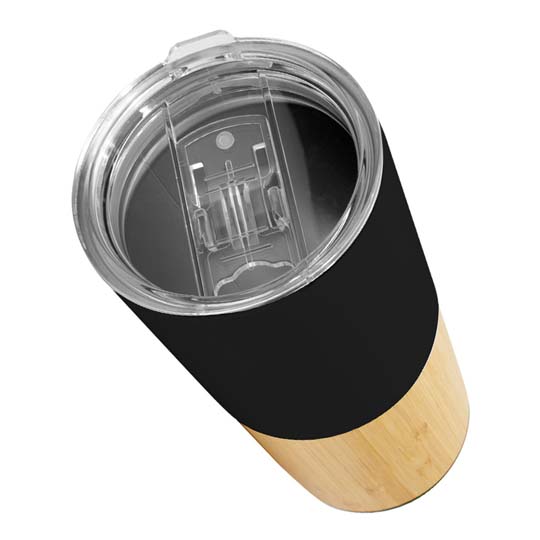 Mug de metálico doble pared aislante, interior Acero inoxidable 201 SS, exterior cubierta inferior de bamboo y cubierta superior de Acero inoxidable 304 SS, modelo «AURUS». Producto BPA FREE, para el contacto con líquidos y alimentos. Fondo de silicona negra ABS anti-deslizante. Tapa removible de plástico PS Crystal Clear con sello cilíndrico de silicona y sistema de cierre/apertura antiderrame. Capacidad 500ml. Presentación en bolsa OPP + caja de regalo de cartón kraft.