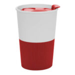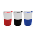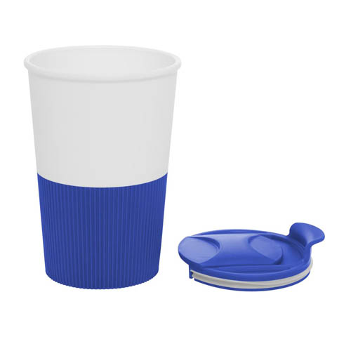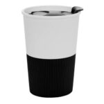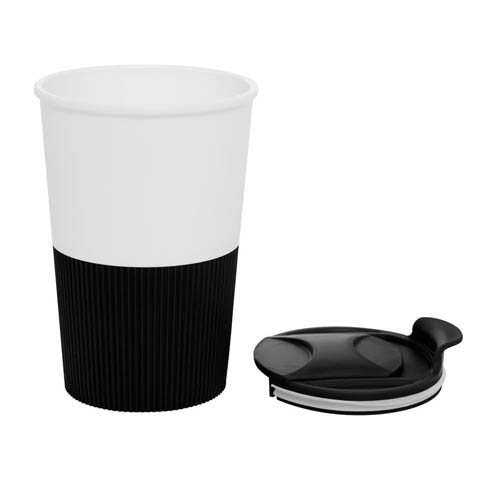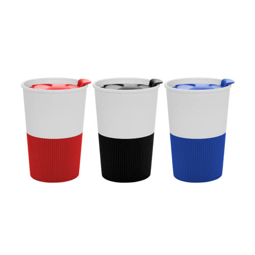 Capacidad 350 ml. Plástico. Mug de plástico con detalles en silicona. Tapa de plástico removible con apertura que se desliza para abrir y cerrar. No utilizar con bebidas gaseosas. Apto para lavavajillas.