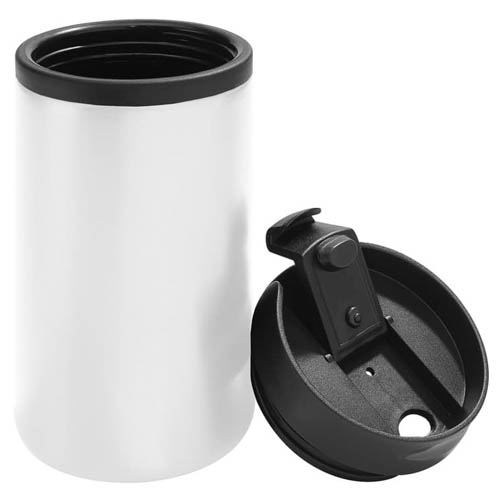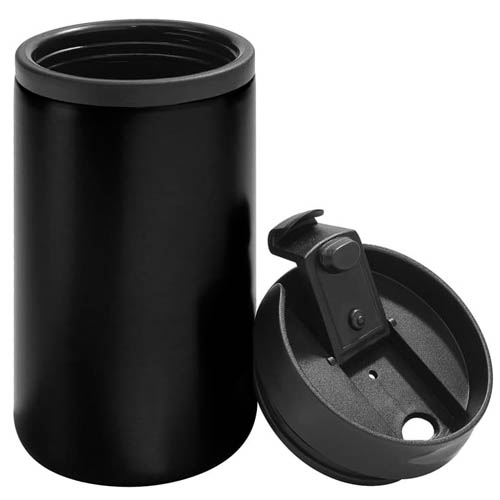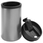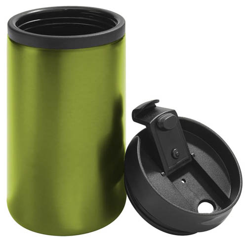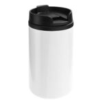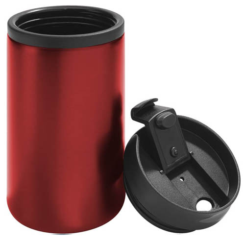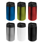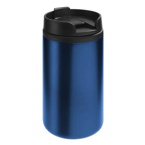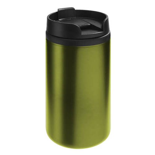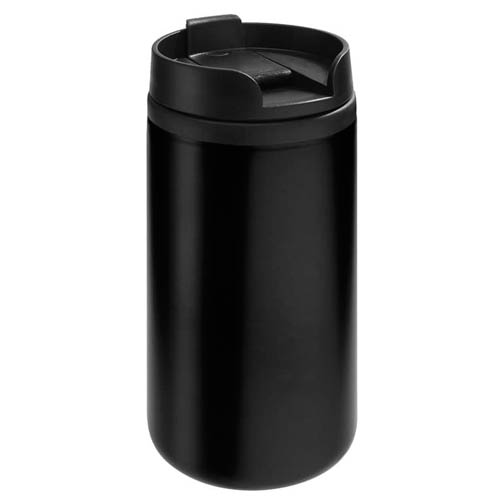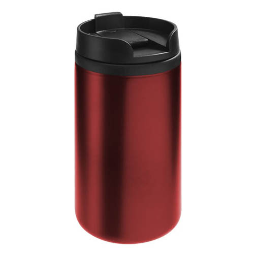 Capacidad 250 ml. Acero inoxidable y plástico. Mug térmico doble pared, exterior de acero inoxidable, interior de plástico, tapa rosca en plástico con apertura para beber. Irrompible. Base antideslizante.