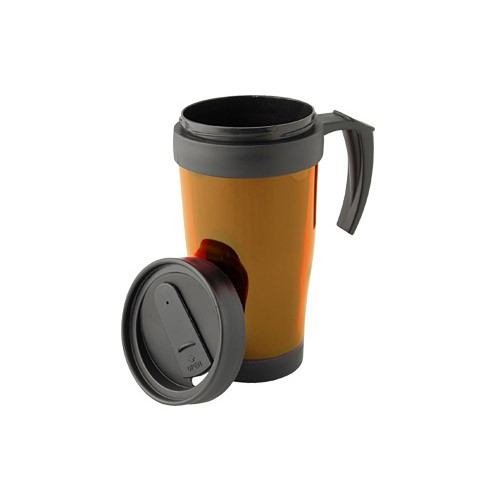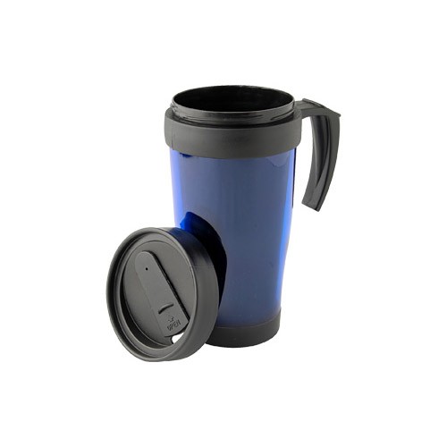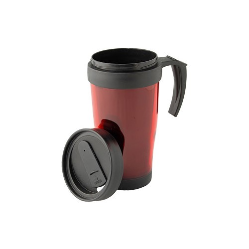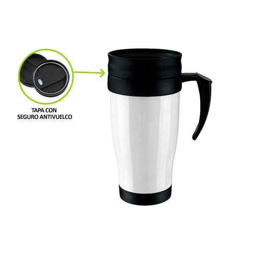 Mug térmico de doble pared aislante con tapa rosca y dosificador. Interior y tapa de PVC negro y exterior de plástico traslúcido.