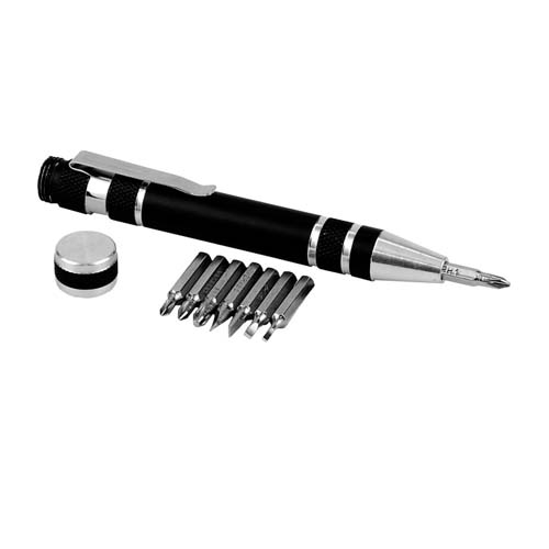 Multi destornillador con clip metálico. 4 destornilladores planos de diferentes medidas y 4 destornilladores phillips. Forma de lápiz.