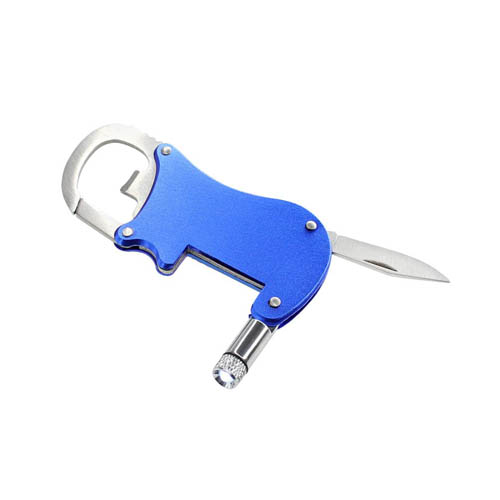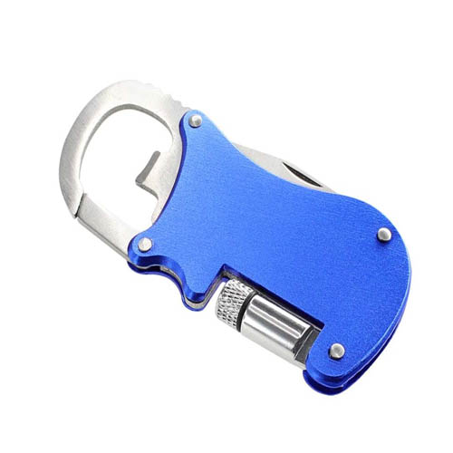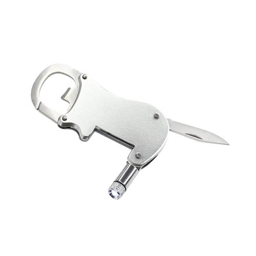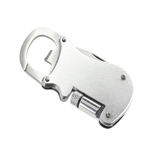 Multiherramienta metálica 4-en-1 con Linterna LED, Navaja, Destapador y Mosquetón.