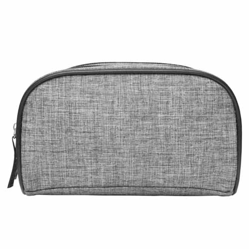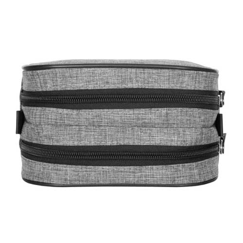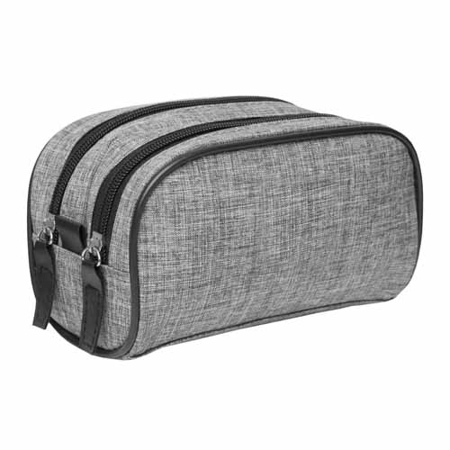 Polyester. Necessaire de dos compartimientos, división movible sujeta con velcro. Detalles en símil cuero. Interior con forro. Tiradores de cierres de símil cuero.
