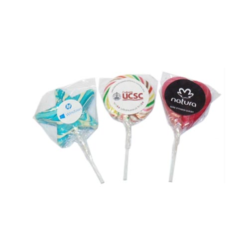 Paletas planas y con figuras de acuerdo a especificaciones especiales, en envase con logo corporativo, Impresión Full Color, Sticker.