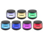 Ø 7,5 x 6 cm. Parlante Bluetooth estéreo. ABS transparente con malla metálica en la parte superior. Botones en color negro. Led que cambia entre 7 colores y 8 modos de luz para elegir. Potencia 3W. Versión Bluetooth: 5.0. capacidad de la batería: 500 mAh. Cable de carga y conexión USB-C en color negro. Presentación en caja de regalo