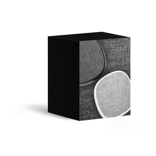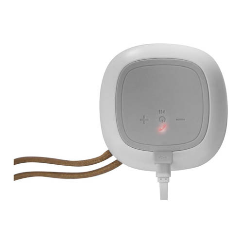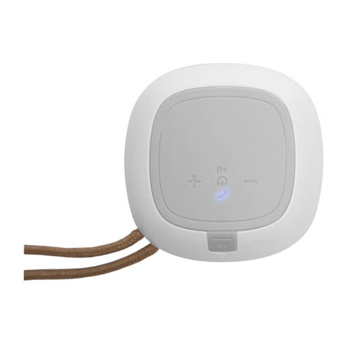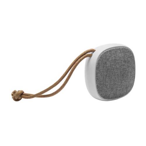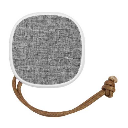 Plástico. Parlante bluetooth cubierto en tela. En la parte inferior engomado antideslizante con botones para encender o apagar, play/pausa y responder llamadas. Botón de retroceso y avance, este último, si se mantiene presionado durante unos segundo pasa a la siguiente pista, estos mismos botones permiten aumentar o disminuir el volumen. Entrada USB incluye cable. Lazo de tela color marrón que permite colgarlo. Alcance 10 mts. aprox. Duración de la batería 8 – 12 hs aprox.