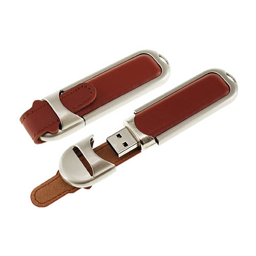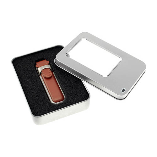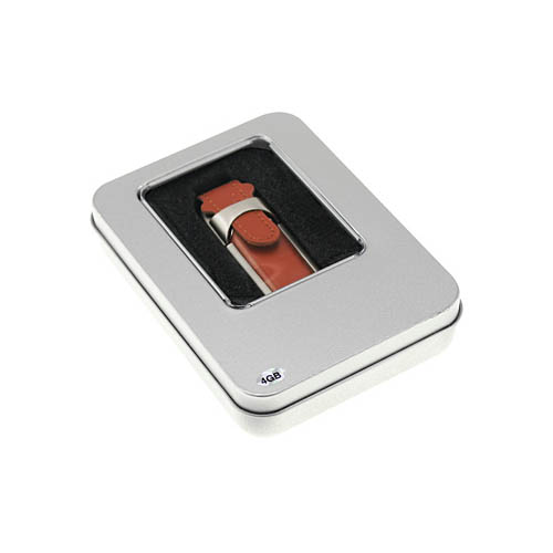 USB Pen Drive ejecutivo de 4GB en metal y cuero. Presentación en caja metálica con ventana.