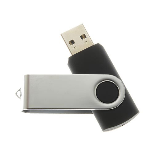 Pendrive, PVC goma, tapa metálica giratoria, empaque plástico individual.