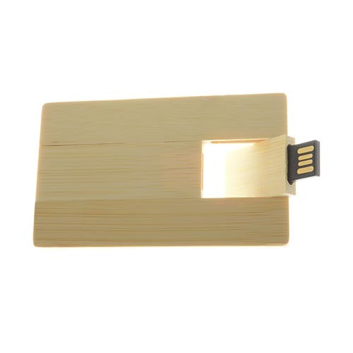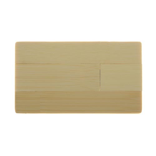 Pendrive en forma de tarjeta de bambú, empaque plástico individual.