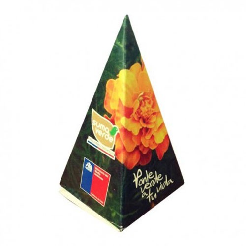 Envase piramidal con semillas de temporada. Diseño completamente personalizado al gusto del cliente.Papel couché. 1/1 colores.( 8 cms de largo por 4 cms de base)