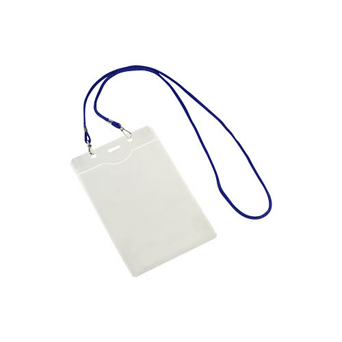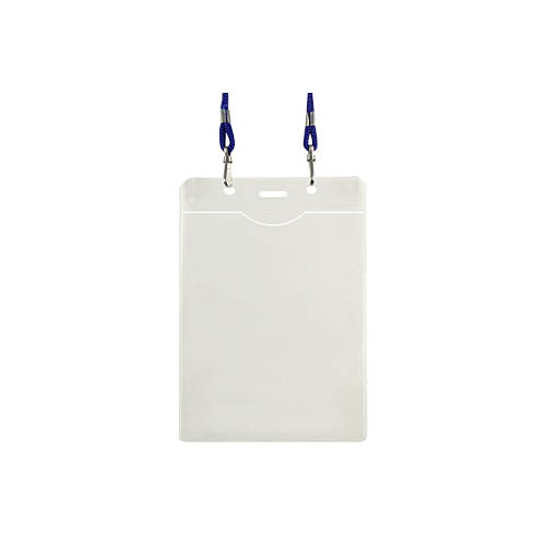 Porta-Credencial Grande de PVC Clear, incluye cordón azul para colgar. Presentación Formato Vertical.