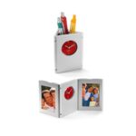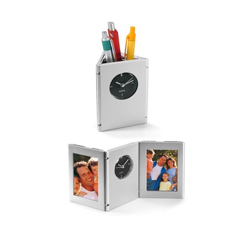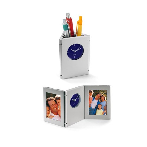 Porta-Lápices plegable con reloj análogo y 2 porta-fotos laterales, cuerpo gris plata.
