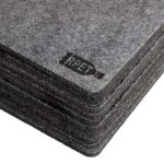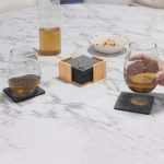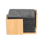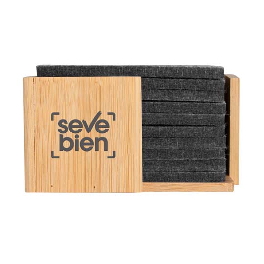 9 x 9 x 0,5 cm. Fieltro de plástico reciclado y Bambú. Set de 10 posavasos. El primero lleva impreso el sello RPET. Soporte de bambú de 10,5 x 10,5 x 5,5 cm Presentación en caja de regalo kraft.