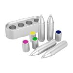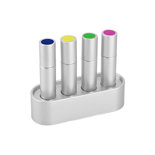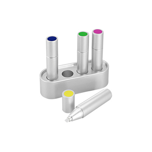 Set de 4 destacadores de color, sobre base plástica plateada. Presentación en caja de regalo color plata.