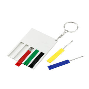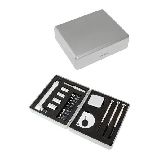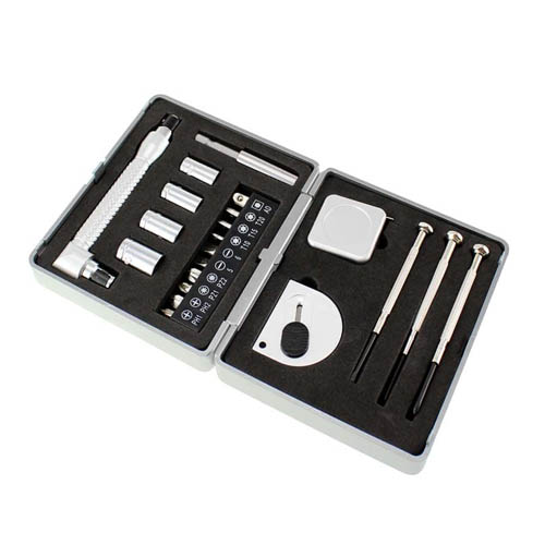 Set de 21 prácticas herramientas en caja rígida plástica plateada. Amplia área para impresión.