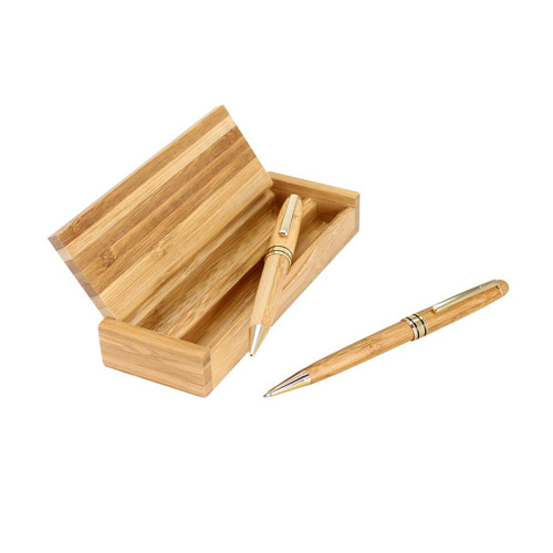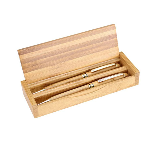 Deluxe Set de Escritura de Madera de Bamboo. Incluye Bolígrafo tinta azul y Porta-Minas con terminales dorados, dentro de elegante Estuche de Bamboo sólido.