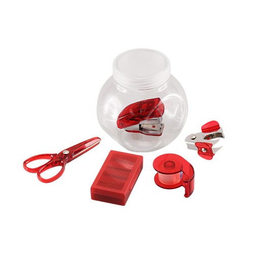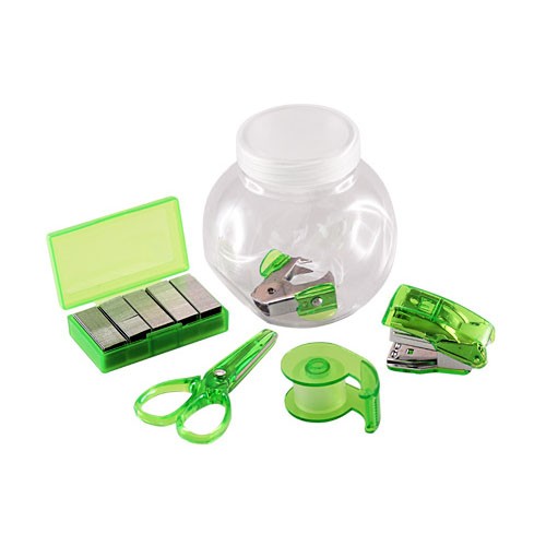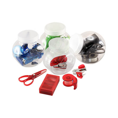Set de oficina en frasco plástico transparente con tapa frozen. Ideal espacio para logo en tapa.