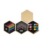 Cartón. Set de pinturas en forma de hexágono. 12 lapices de colores, 1 sacapuntas, 12 crayones, 1 goma de borrar, 12 acuarelas y 1 pincel.