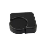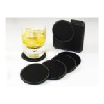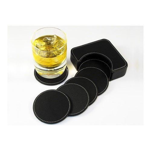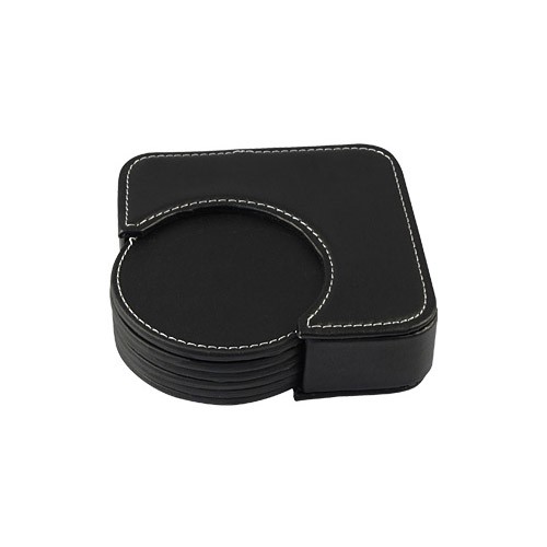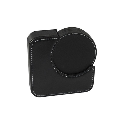 Set de 6 posavasos redondos, en PU negro. Incluye contenedor cuadrado. Infaltable en tu bar.
