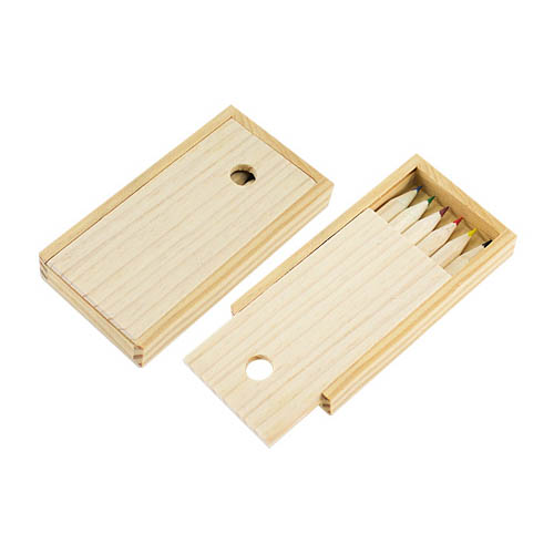 Set de 6 Lápices de Colores con cuerpo hexagonal de Madera natural. Presentación en delicado estuche de Madera natural con tapa corrediza.