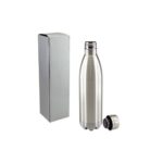 Termo modelo “Botella” de 3/4 litro, en Acero inoxidable, tapa rosca. Presentación en estuche de cartón laminado plateado.