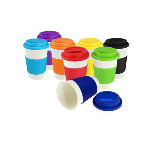 Vaso cerámico blanco de 400ml, con tapa y grip (mango) texturado de silicona de color. Presentación en caja de cartón blanco.